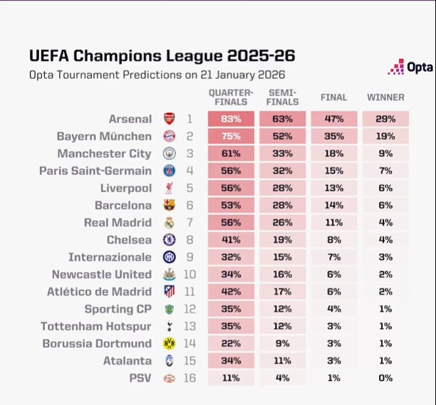 1月21日讯 本赛季欧冠已经进行7轮,OPTA统计各队夺冠概率,阿森纳29%的概率位列第一,拜仁第二、曼城第三。